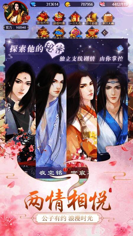 《宫廷遗珠》为玩家呈现了一段刻骨铭心的爱情故事。游戏中有4位风格各异的美男,他们各有所长。玩家可以依据自己的喜好和眼缘挑选一位开启恋爱之旅,但要成功牵手,得先揭开他背后的秘密。