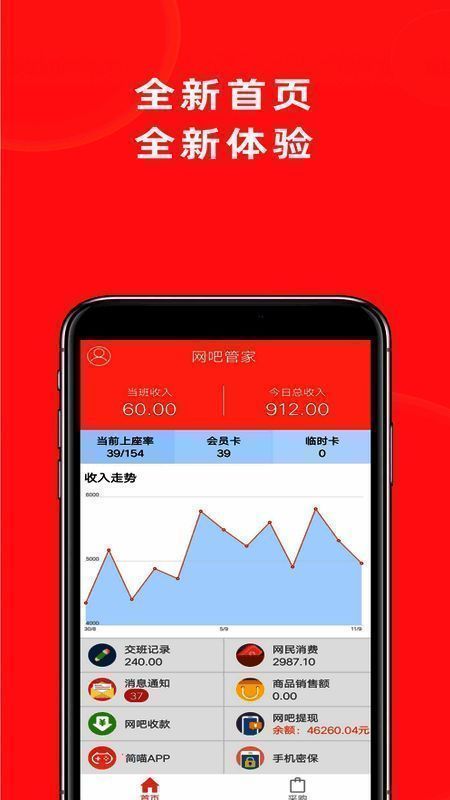 网吧管家 app 堪称您的贴身管家,可随时随地关注网吧的实时上机人数、现金收入以及交班信息,让网吧管理紧跟潮流,更加高效。