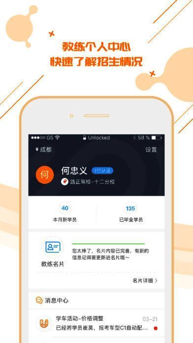 4. 消息中心,即时推送最新分配学员消息、系统更新消息和教练名片上的意向学员信息;
