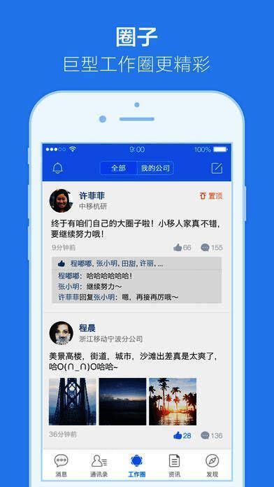 【工作圈】方便员工与全体同事分享工作动态和生活见闻。
