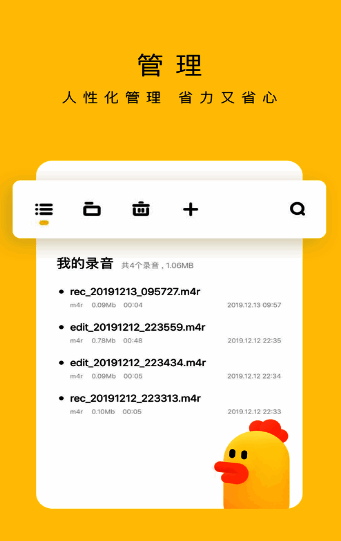 各位好,我是号称录音界“战斗鸡”的《录音鸡》,这是一款极为实用且高效的手机录音工具。它能让用户在学习时录制重要知识点,会议中记录重点内容。操作十分人性化,就像傻瓜式一样简单,让你轻松上手录音;管理也很便捷,让你管理录音省力又省心。