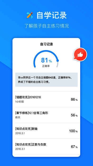 2、自学记录:查看孩子课外练习情况,轻松参与日常学习。