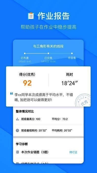 1、作业报告:全面了解孩子作业完成及知识点掌握情况,还有智能学习诊断助力孩子作业进步。