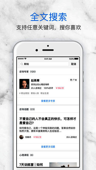 3、预约心理咨询:通过提供城市、价格和咨询方向等多维度的智能筛选,为你找到靠谱专业的心理咨询师,直接在线预约和支付,即可享受一对一的语音、视频或面对面咨询服务;