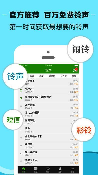 有百万免费铃声,轻松一键设置,铃声、彩铃、短信、闹铃都能搞定。