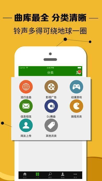 2、铃声分类丰富多样,涵盖流行金曲、影视热曲、动漫游戏、短信闹铃、DJ舞曲、搞笑另类、网络神曲、网友上传等,是曲库最齐全的铃声应用。