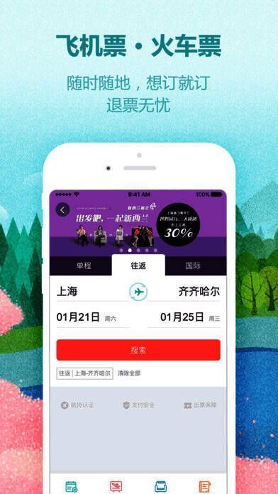 2. 机票:提供接送机服务,无需排队,可预订国内所有航线打折机票,能快捷预订往返机票,实时查询航班动态,手机专享优惠,支持在线退款申请及微信支付。