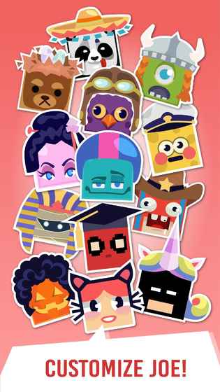 《跳跃吧乔伊!》是一款休闲益智类手机游戏,玩法类似曾经大火的《涂鸦跳跃》。游戏有两种操作方式,点触或滑动皆可,玩家可按个人喜好选择。在游戏中,玩家要控制主角一路向上跳跃,躲开障碍物,跳得越高分数越高。游戏融入了大量收集和解锁内容,有多样角色可选,道具新颖易上瘾。