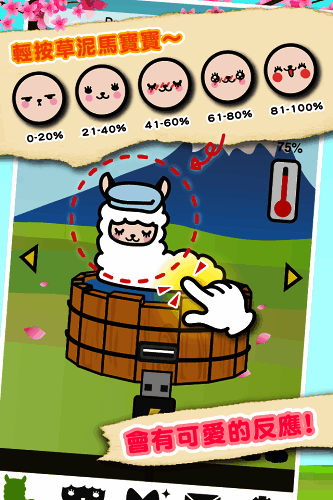 1、手机充电可加热温泉水,草泥马身体回暖后,就能诞生属于自己的草泥马宝宝。连接充电器后,程序会自动启动。