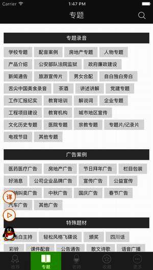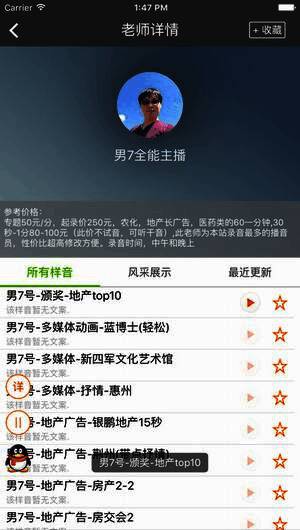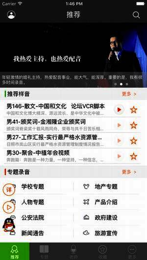 《深度配音》是一款功能丰富的手机娱乐软件,也是在线配音平台的手机客户端。为方便苹果用户配音,它邀请了各地知名配音老师随时在线服务。用户能海量试听不同种类样音,涵盖广告片、专题片等各类配音专题,还可收藏心仪的配音老师和样音。