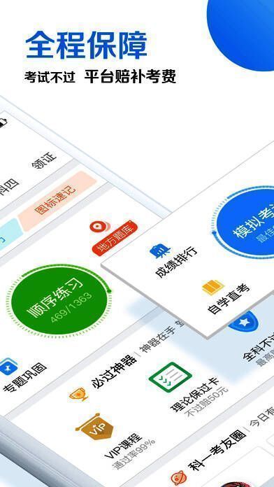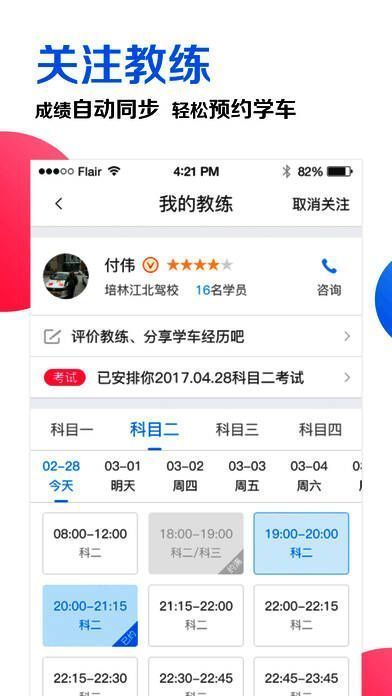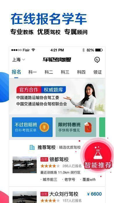 2、考驾照流程全面覆盖,从选驾校、报名,到理论模拟考试、科目一、科目二、科目三、科目四,再到新手上路,一个APP就能全部搞定。