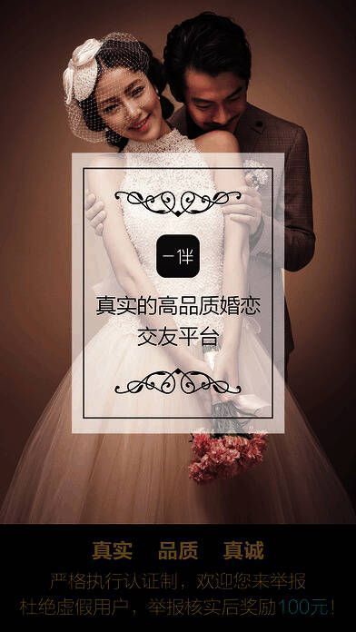 《一伴婚恋》是一个真实可靠的高品质婚恋交友平台,上线仅7天就有用户成功牵手,每周能见证700对用户相识相爱。所有会员都需进行真实身份认证,有缘的单身男女可以坦诚地开启恋爱之旅,让幸福更快、更真切地到来!