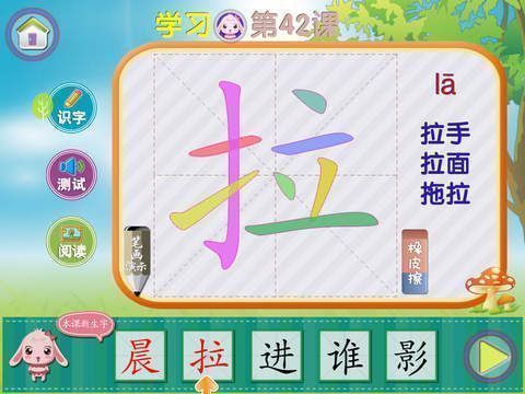 1、具备标准发音、笔顺演示、标准拼音、组词、图片(alt="识字相关图片")、我来书写等6项功能;