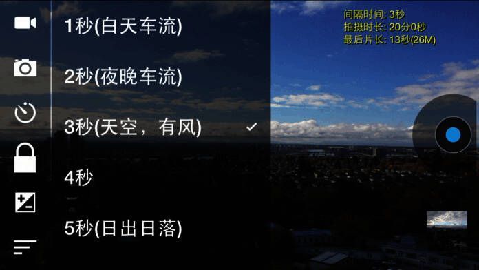 这个软件能拍摄的题材很多,像日出日落、云彩移动、山间太阳影子移动,还能对准街道上的车流人流、房间里的太阳影子。甚至固定在车上,把上下班路上的景物压缩到几秒的视频里,也很有趣。
