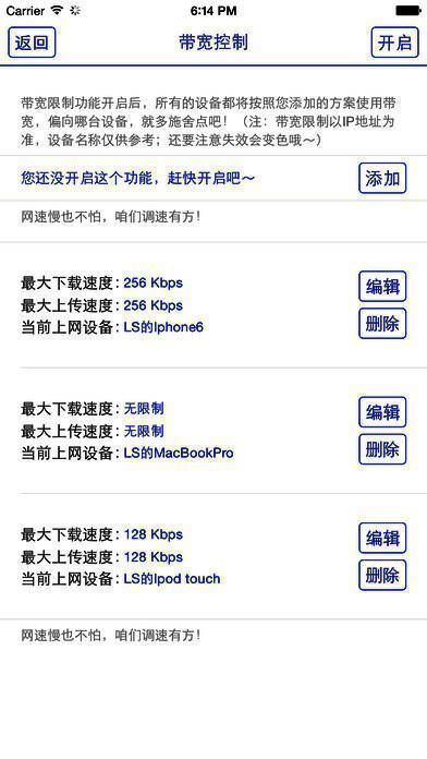 1、开启网速控制功能,管理设备网速,让你心仪的设备享受最快网速。