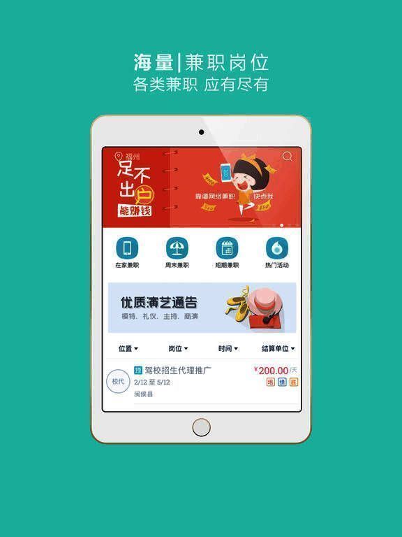 1、海量兼职岗位:可快速报名,选择就近上岗;