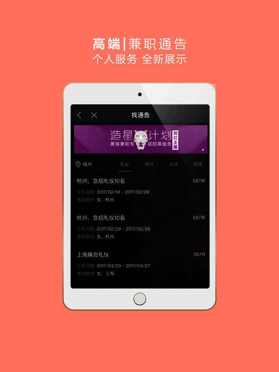 7、兼职类别丰富,涵盖派单兼职、促销兼职、文员、销售、服务员、设计、会计、模特、礼仪、家教兼职、演出、校内招聘、翻译等。