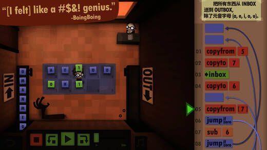每层楼的布局(也就是谜题)旨在模拟一台简单的计算机。例如,游戏中会有大量箱子(代表数据和函数)运到你所在的这一层,左边设有收件箱,右边有发件箱,玩家要做的就是让办公人员按正确顺序依次提交正确的箱子。左右中间还设有几个槽,可用于储存箱子以备后续使用。