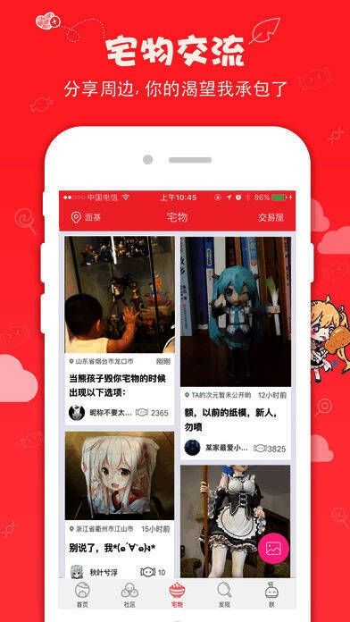 宅物交易:可以晒出用户收藏的周边宝贝,和同好进行分享交易