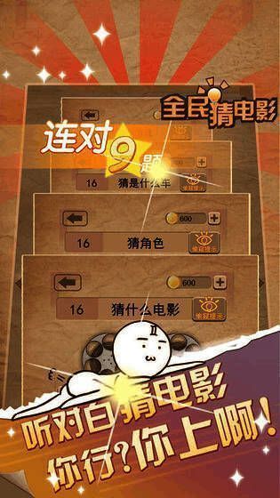 《全民猜电影》是一款休闲益智游戏。玩家在游戏里聆听经典电影对白,进而猜出电影、演员或角色。游戏设有四个难度等级,还能使用道具降低难度。游戏中经典片段让人乐在其中。