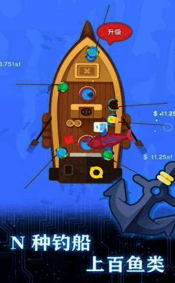 2、能升级船只,解锁更多独特鱼类,收获更多金币,换更豪华的船