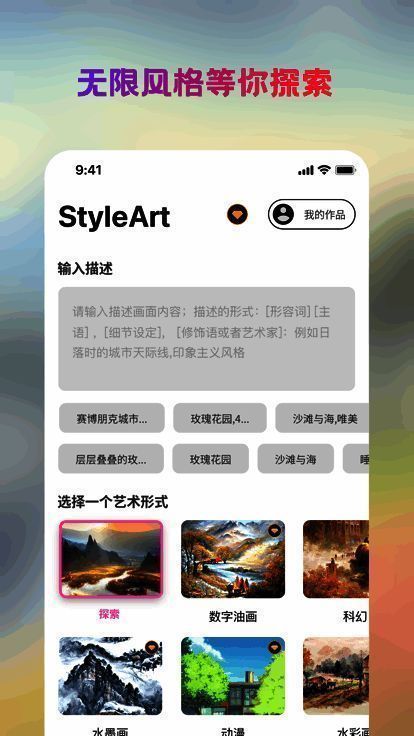 StyleArt苹果版的核心亮点在于其强大的AI图像生成能力。用户只需输入关键词或描述想要的画面内容,系统便能在短时间内自动生成高质量的艺术作品。无需复杂设置,即使是零基础的用户也能快速上手,享受创作的乐趣。