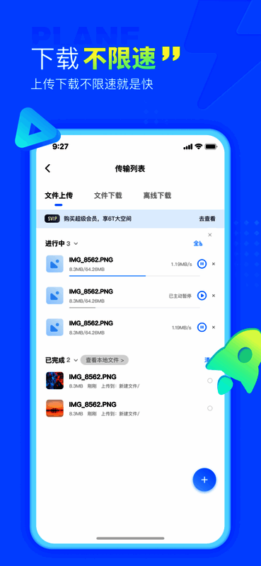 小飞机网盘的最大下载速度可达20M/s,远超国内主流网盘的限速机制,真正实现不限速上传与下载。用户可将手机本地文件上传至云端服务器,实现永久保存。此外,软件支持拖拽、复制粘贴、远程下载等多种上传方式,简化操作流程,减少频繁点击带来的不便。