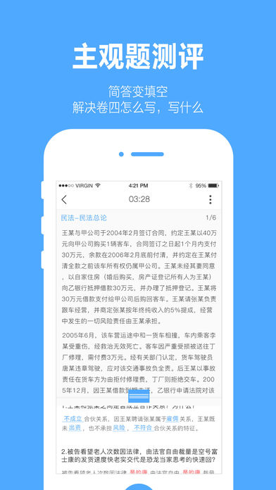 首创“精确版—概括版—主观题”三级测评模型:精确版聚焦单点知识漏洞扫描;概括版模拟真实考场压力,进行跨学科综合能力诊断;主观题模块独家接入AI批改引擎,支持法言法语识别与采分点匹配,目前已覆盖刑法案例分析、行政诉讼文书写作等6大高频题型。