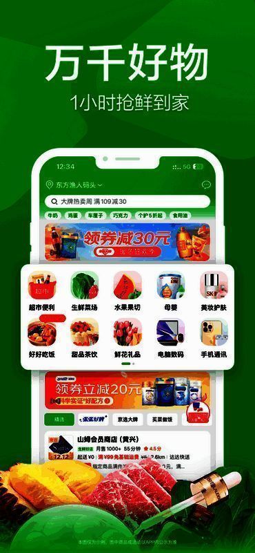 生鲜、肉、蛋、菜、水果、水产、熟食、乳制品、粮油副食、纸、个洗清洁、家庭清洁、酒、水饮、冷冻冷藏、休闲食品、手机、数码、家电,家居、家装、美妆护肤、服饰、母婴、医药、鲜花、蛋糕烘培等商品一站购齐,满足你日常购物的所有需求。