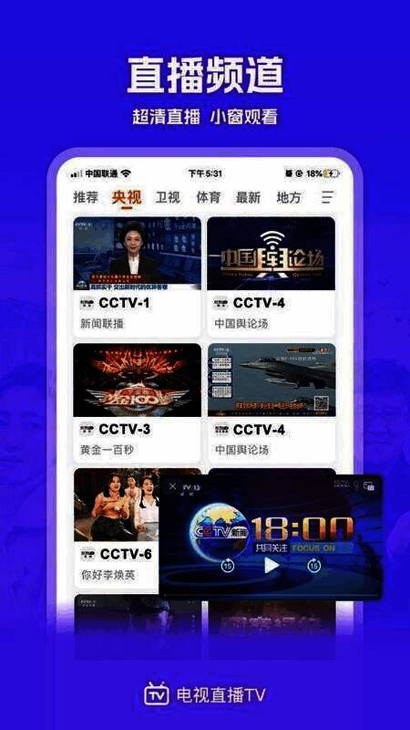 全面覆盖多达1000个直播频道,国内、国外以及港澳台的频道全部涵盖。支持8天节目全回看,还能对未来3天节目提前预约并提醒。拥有多线路、多播放源,播放清晰流畅,可秒换频道与线路,能根据网络状况做出最优化选择。具备悬浮播放功能,可让用户边玩手机边看直播。提供自定义频道,满足用户个性化观看需求。可边看边吐槽,随时发弹幕,大家一起欢乐看电视。互动竞猜还能赢云币,到云币商城换礼品。操作简单流畅,软件页面整齐美观又大方。