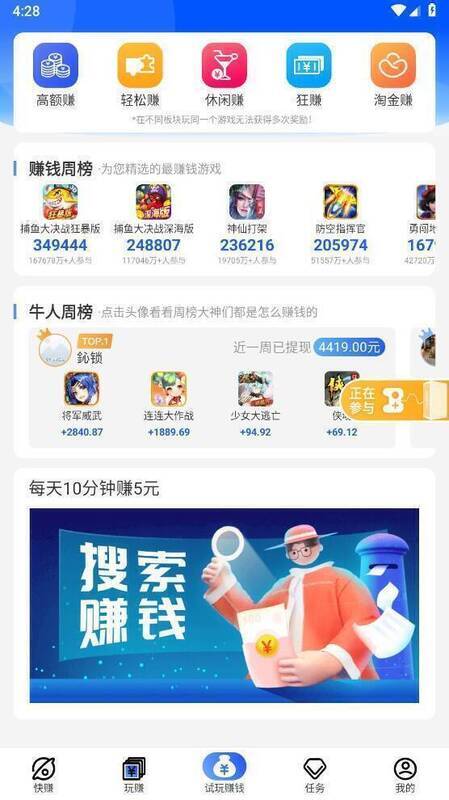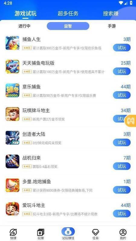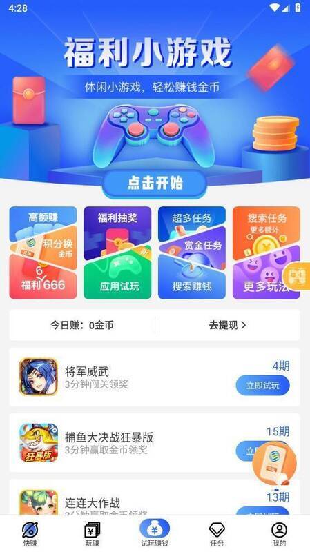益玩赚是手机应用程序,用户可借玩游戏、试玩应用、看视频等得金币换现金。应用累计提现超 2 亿,福利抽奖 100%中奖。内置 50 多款经典小游戏,涵盖消除、跑酷等类型。还有不同任务,完成可获更多金币,操作简单,随时随地能赚零花钱。