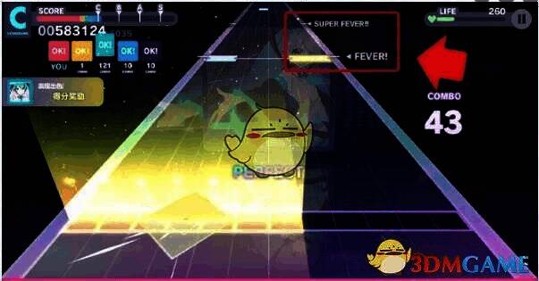2、在该时间段前玩家的合计COMBO数到达对应数值要求,即可发生FEVER或SUPERFEVER,过关后会还能获得追加掉落道具。