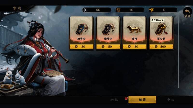 玩家们在获得铜钱后,可在游戏里的铜钱商店里将它消费出去,目前该商店共有四种不同的道具可以用铜钱来进行购买。其中,只有军令状是每日限购的,玩家们要是急需碎银来购买武将,可每天用铜钱来买满军令状速刷碎银。