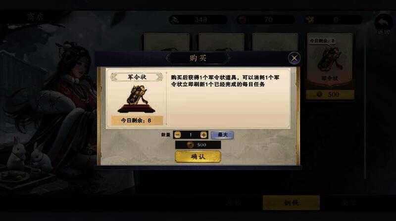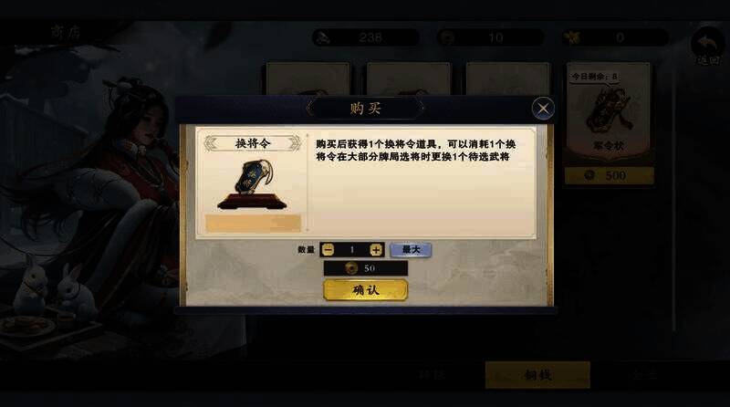 而其它的道具中,变阵令和换将令的优先级更高,前者能直接帮玩家更换手牌,后者则能进行换将,都很实用。但它们并不限量,使用时也存在着次数限制,所以玩家们按需来进行购买即可,无需囤积上太多。至于虎符则不是特别常用,非特定情况下玩家们可不用购买。