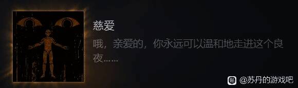 《苏丹的游戏》中的特殊成就的数量是非常多的,慈爱就是其中完成难度非常大的一个成就,“哦,亲爱的,你永远可以温和地走进这个良夜……”,想要做这个成就可以打正常的密教恶神线,无论有没有通过三次质疑看到真正神面,在恶之华事件结束后都会揭晓神面。