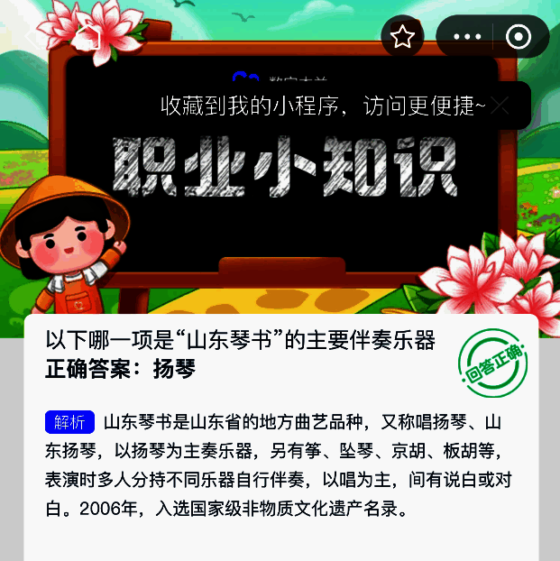 以下哪一项是“山东琴书”的主要伴奏乐器?这是支付宝蚂蚁新村2025年4月11日题目,每天在蚂蚁新村答题,不仅能学到有趣的职业小知识,还能提高木兰币的产速,帮助小镇建设。今天正确答案是【扬琴】。山东琴书是山东省的地方曲艺品种,又称唱扬琴、山东扬琴,以扬琴为主奏乐器。