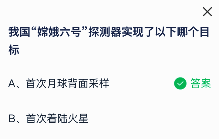 我国“嫦娥六号”探测器实现了以下哪个目标?这是支付宝蚂蚁庄园小鸡答题4月12日题目,支付宝小鸡答题是大家非常喜欢的活动,大家获取饲料就可以喂养小鸡领取更多的蛋去帮助更多的人了!今日正确答案是【首次月球背面采样】,2024年6月2日6时23分,嫦娥六号成功着陆在月球背面南极-艾特肯盆地预选着陆区,开启人类探测器首次在月球背面实施的样品采集任务。