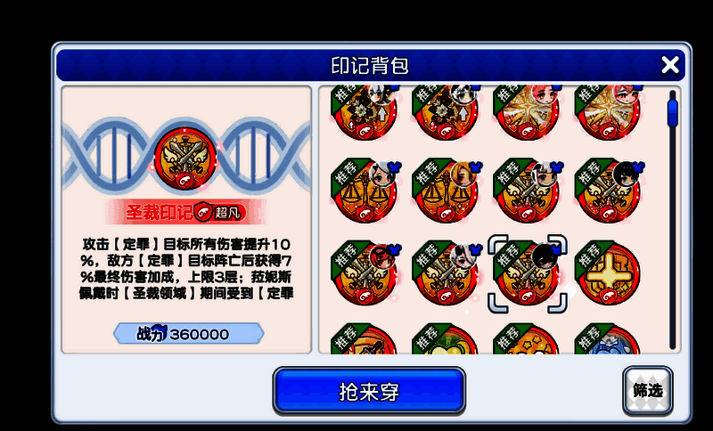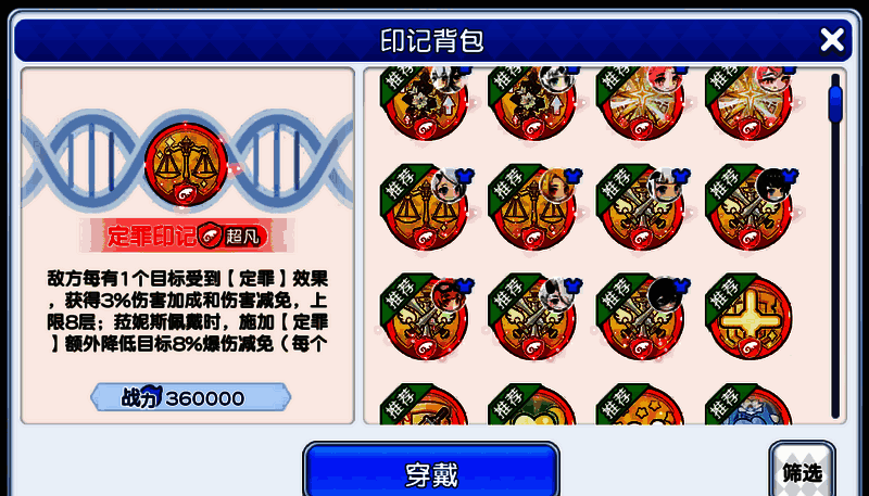 噬魂印记:群桩特化强力印记,击杀六个目标可以叠60技能伤害,再算追击和多动以及两回合,收益是及其恐怖的。推荐必备一个,也基本只需要一个(需要注意前期没法击杀目标的新手玩家噬魂用处暂时不大,所以慎重在箱子选取)。大后期有富裕可以抽取第二个给辅C使用收益不高。