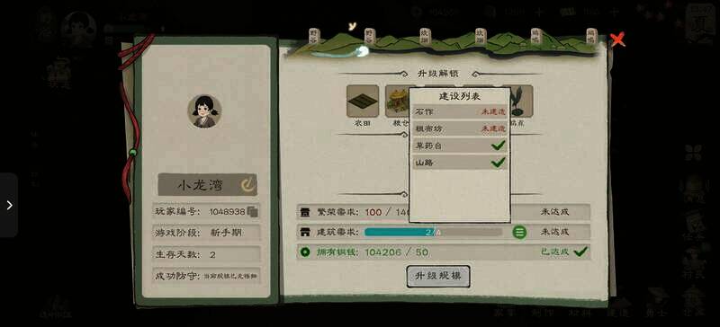 3.左上角头像点开可以在建筑需求那里查看我们升级需要的建筑,前期人手不够的情况下,需要什么采什么,然后迅速造好升2级,可以前往上层了