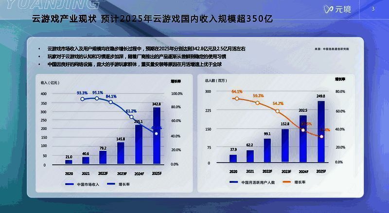 简单给大家分享一下云游戏现阶段的产业现状以及行业对云游戏未来的预测。信通院预测2025年云游戏整体收入在国内将达到350亿,并拥有2.5亿月活玩家。2022年是我们看到云游戏实质上进入规模化的一年,我们的不少客户都在逐步扩量增长的过程当中。玩家对于云游戏的认知也在逐步加深,从了解云游戏,到已经熟悉、习惯这种游戏模式,并且会进行持续体验及接受商业化付费,这是产业健康发展的一个很重要的特征。
