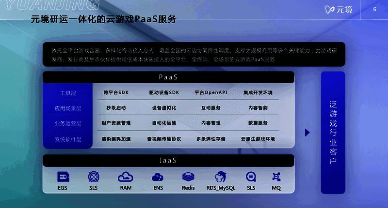元境提供的是云游戏研运一体化服务平台,底层基于阿里非常强大的基建能力,提供了系统软件层作为稳定的业务支持,业务运营层高效支撑频繁运营操作需求,应用场景层提供让产品有新能力新亮点的支撑,工具层提供给开发者便于接入的形式,依托全平台容器、多样化的终端接入方式、覆盖全国的云边协同弹性调度、支撑大规模商用等多种关键能力,为云游戏的研发商、发行商、生态伙伴提供低成本、快速接入的全平台、全终端、全场景的云游戏PaaS服务。