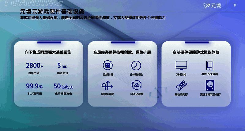 另一方面是硬件的基础设施。云游戏有一个很明显的属性,接入点要离用户足够近。元境在这一方面有非常明显的优势,我们能够覆盖到全国2800个边缘节点,提供端边不超5毫秒的延迟,同时这个网络覆盖大、运行周期长,经历了很多过往CDN业务的考验,其可靠性非常高,安全防护能力也非常强。