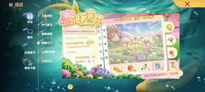 1.灵气复苏、雪融春暖、春暖花开等活动将于3月1日23:59结束,快快抓住节气的尾巴~