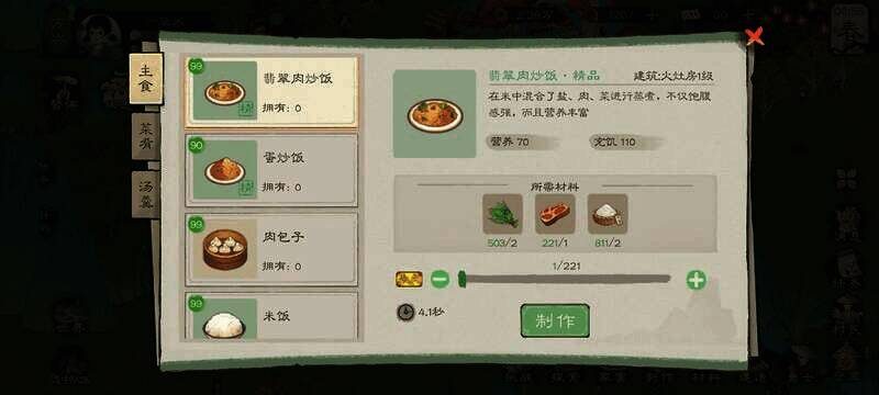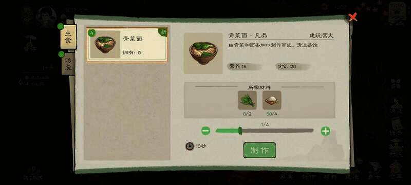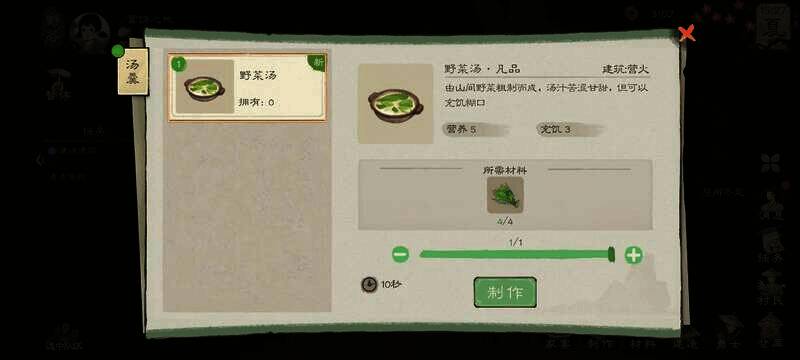 我们这里直接制作野菜面,野菜汤的话,太亏了,要的食物多,加成还少,具体价值大家可以看图,上面的营养与充饥
