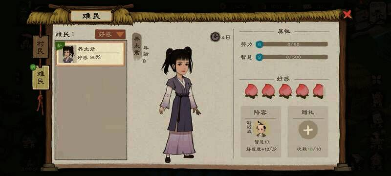 还有就是前期如果有人敲门要加入的话,是一定要同意,让他加入,因为前期人力也是一个重要资源,你有小孩的话,直接给他小孩陪玩,快速增加好感度,不要用食物来增加好感度,因为前期食物较少,而且给的东西比较差,他好感加的也少,慢慢等它好感自动添满加进来成为村民