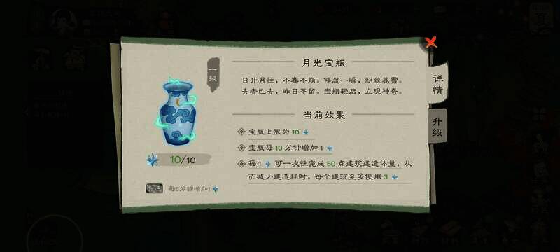 这个是有大用的,他每十分钟会弹下一滴月光水,最多存十滴,月光水能用来缩减建造时间