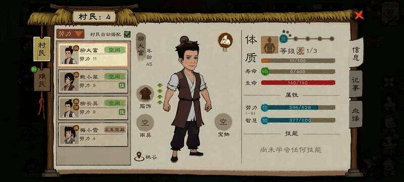这游戏是有生死系统,打开村民主页,可以查看他能活多少岁,年龄越大,他样貌就会越老,就越接近死亡,不过不管他年龄多大,你都可以让他来进行工作,没有养老,只有压榨