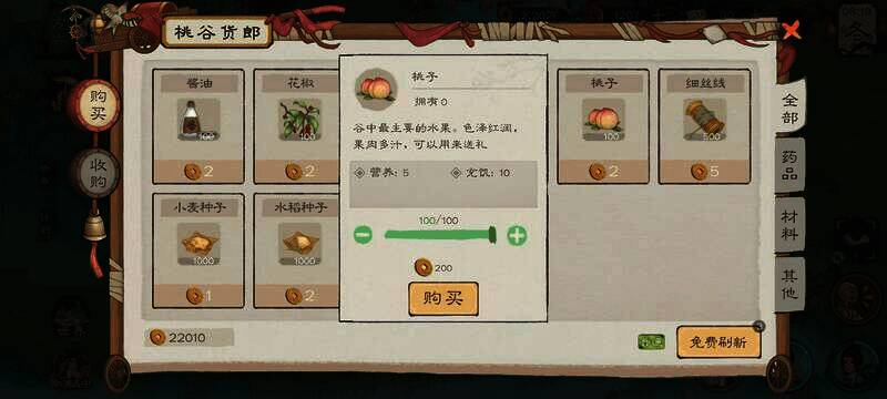 我们点开商人寻找桃子,这个别不舍得,反正只是要铜币罢了,全部买完