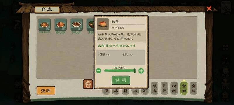 这时我们就拥有了400个桃子,这桃子可以直接吃的,我们打开仓库,点击使用食物食用桃子,直接拉满,把桃子全吃了,当然,你也可以省着吃,把桃子放上家宴啥的