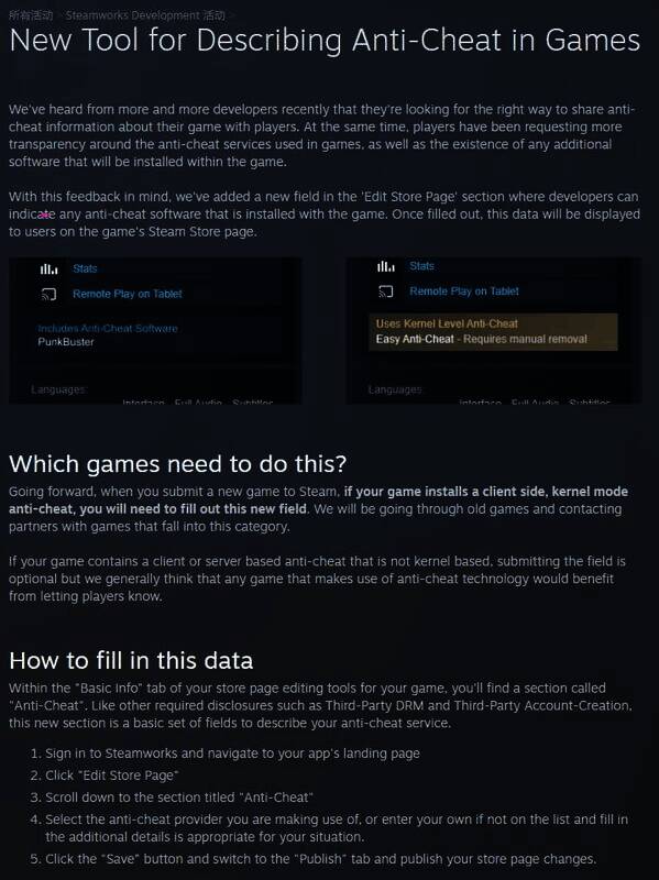 Steam在最新的规定中提到:“越来越多的开发者表示,他们正在寻找与玩家分享游戏反作弊信息的正确方式。与此同时,玩家一直要求游戏中使用的反作弊服务更加透明,以及告知游戏中将安装的任何附加软件的存在。”